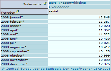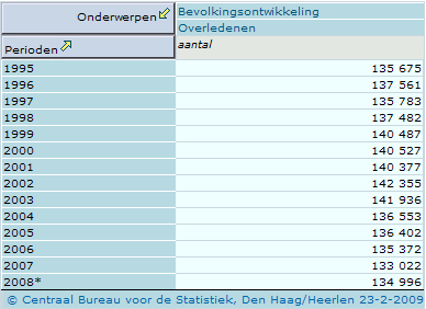 plaatje: bulletHet voorlopig sterftecijfer 2008 is vastgesteld door het CBS op 134 996.