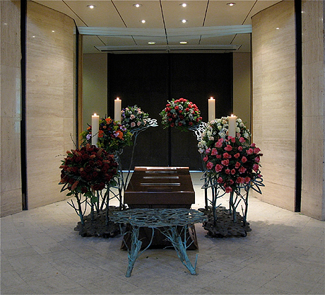 De barokke kunstwerken in groen gepatineerd brons en messing van Van Kuijk zijn bedoeld om bloemstukken en kaarsen op te leggen en omarmen als het ware de baar met daarop de kist met de overledene. De objecten contrasteren met de nieuwe zakelijkheid van het Rijksmonument en versterken daardoor het karakter van de ruimte. De organische vormgeving refereert aan de wandschildering van Albert Muis in de aula.