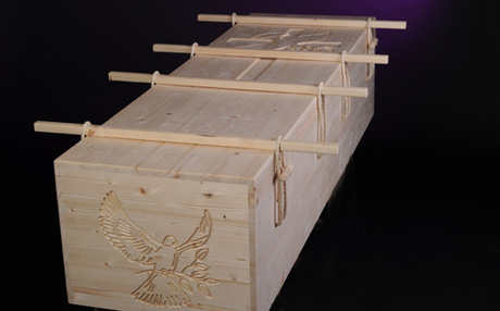 De kisten worden gesloten dmv houtje touwtje, de keuze uit bekleding is ruwe zijde of ongebleekt katoen met koord. U bent altijd van harte welkom in onze showroom.