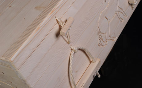 De afgeronde kisten zijn voorzien van met de hand ingebrachte gravures en er kunnen naar wens ook andere gravures worden ingebracht, diverse handvatten zijn mogelijk.