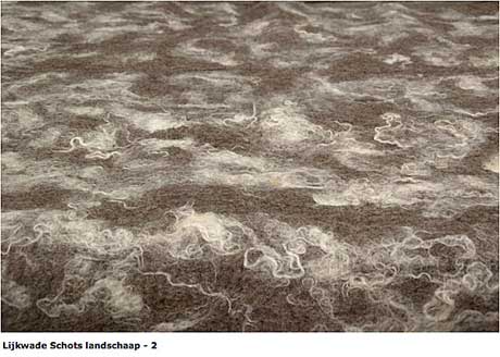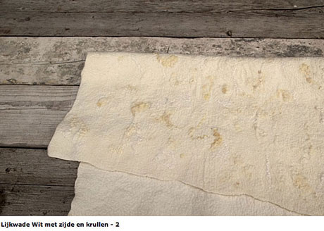 "De lijkwaden maak ik van diverse wolsoorten in hun natuurlijke kleurschakeringen en structuren. Verder gebruik ik natuurlijke vezels zoals zijde, vlas en linnen. Ik heb verschillende lijkwaden op voorraad maar ik kan ook in overleg een persoonlijk ontwerp maken en deze uitvoeren."