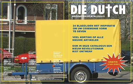 Die DutchLucyeileen uit Mexico studeerde onlangs af aan de Hogeschool voor de Kunsten te Utrecht met een catalogus waarin ze de Nederlandse uitvaartcultuur op de hak neemt. Zelf zegt ze hier het volgende over:Funerals in Holland are very formal and sober, while in Mexico they are more like a party. The purpose of this catalogues is to mock funerals and death in Holland. Die Dutch suggests a kind of "do it your self" funeral that is very personal but most important very cheap! This makes "Die Dutch" not only a brand but also a statement. Blader door de catalogus door rechts een keuze te maken. |